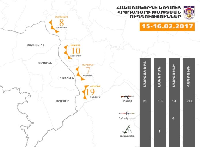 Փետրուար 15 լոյս 16-ին Ղարաբաղա-ազրպէյճանական հակամարտ զօրքերու սահմանագիծին վրայ, հակառակորդը՝ տարբեր տրամաչափի հրաձգային զինատեսակներէն՝ հրադադարը խախտած է 44 անգամ` հայ դիրքապահներուն ուղղութեամբ արձակելով շուրջ 500 կրակոց: