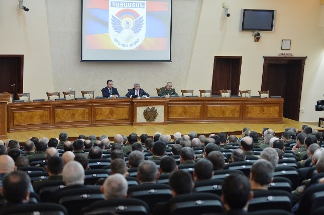Նախագահ Սարգսեան ՀՀ ԶՈՒ ղեկավար կազմին հետ հանդիպման ընթացքին խօսած է Հայաստանի Հանրապետութեան հանրային եւ ազգային անվտանգութեան օրախնդիր հարցերու մասին, պատասխանած հաւաքի մասնակիցներուն հետաքրքրող հարցերուն: