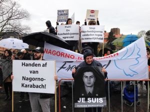 The demonstration of the Dutch-Armenians began near the Palace of Peace. With loud screams, the demonstrators marched through the streets of The Hague and reached the Embassy of Azerbaijan where they screamed louder and louder. The heavy winds and rainfall didn’t stop them from holding a nearly one-hour rally. There were speeches in different languages and performances, including speeches and performances by the youngest participants.