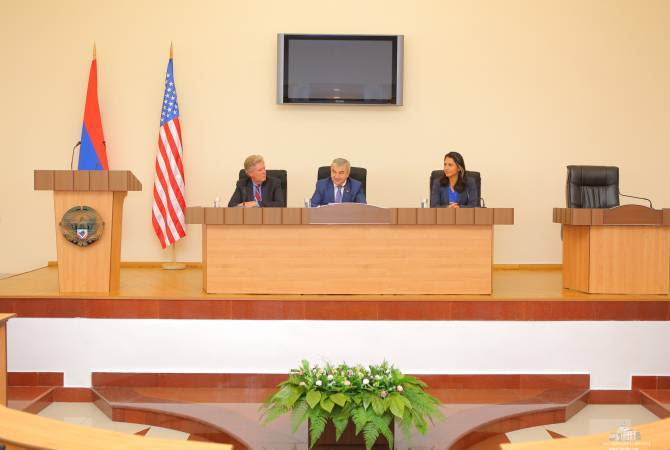ԱԺ նախագահի աշխատասենյակում տեղի ունեցած առանձնազրույցից հետո կայացել է ընդլայնված կազմով հանդիպում, որտեղ հյուրերին միացել է Ամերիկայի Հայ Դատի գրասենյակի տնօրեն Րաֆֆի Համբարյանը: Նիստերի մեծ դահլիճում կազմակերպված հանդիպմանը մասնակցում էին Արցախի օրենսդիր ու գործադիր իշխանությունների ներկայացուցիչները, հանրային-քաղաքական և գիտակրթական ոլորտների պատասխանատուները: