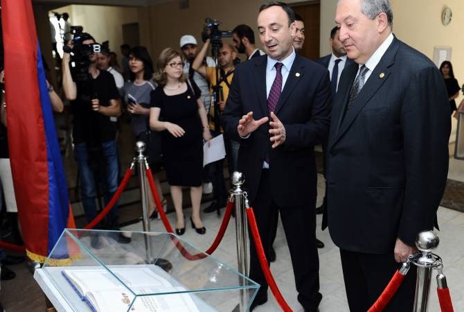 Ինչպէս կը փոխանցէ «Արմէնփրես»-ը, ՀՀ նախագահի գրասեկեակէն կը տեղեկացնեն, որ Հանրապետութեան նախագահը դիտած է Հայաստանի Սահմանադրութիւններուն եւ պետական խորհրդանիշներուն նուիրուած ցուցահանդէսը, մասնակցած է հանդիսաւոր ընդունելութեանը եւ կտրած է տօնական տորթը:
