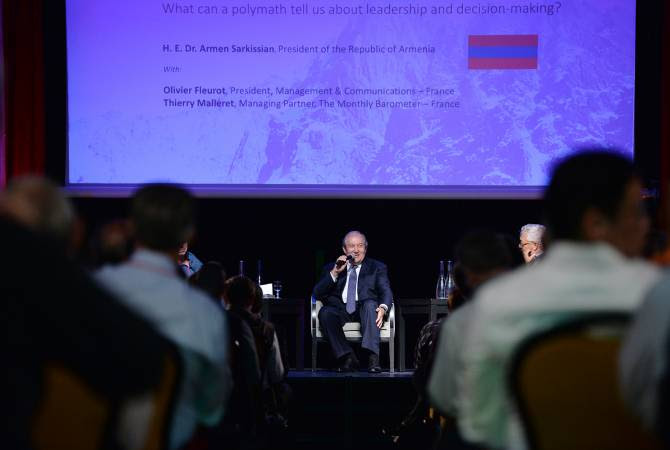 Գագաթաժողովի ծիրէն ներս ելոյթ ունենալով որպէս գլխաւոր բանախօս՝ Հանրապետութեան նախագահ Արմէն Սարգսեան իր տեսակէտն ու մօտեցումները ներկայացուցած է քննարկուող թեմաներուն եւ ժամանակակից աշխարհին մէջ տեղի ունեցող իրադարձութիւններուն եւ մարտահրաւէրներուն վերաբերեալ: