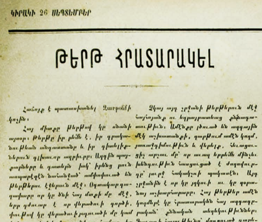 Զարթօնք»-ի տարեդարձին առիթով դարձեալ յարմար կը տեսնենք իր առաջին թիւին մէջ տեղ գտած սոյն անժամանցելի յօդուածը վերատպել:
