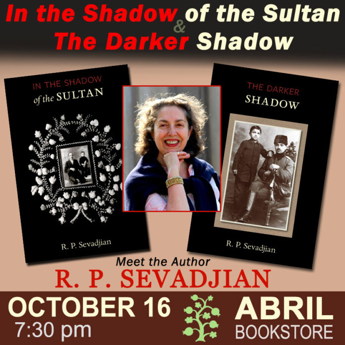 Nor Or, Los Angeles – Armenian author from England, R. P. SEVADJIAN will be in town to present her newly released novel, THE DARKER SHADOW which is a sequel to her previous book, IN THE SHADOW OF THE SULTAN on TUESDAY, OCTOBER 16, 2018 at 7:30pm at ABRIL BOOKSTORE – 415 E. Broadway, Glendale, CA. Admission is free with reception to follow.