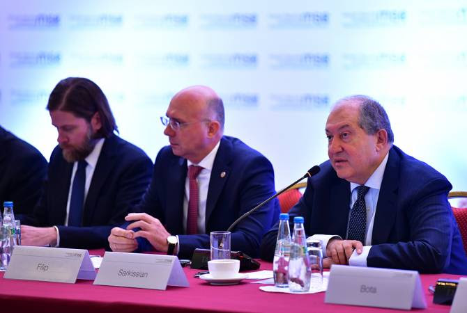 ՀՀ նախագահի աշխատակազմի հասարակայնութեան հետ կապերու վարչութենէն կը տեղեկացնեն, որ նախագահ Արմէն Սարգսեան ելոյթով հանդէս եկած է տարածաշրջանային հակամարտութիւններուն վերաբերող քննարկման՝ նշելով, որ կը ցանկայ իր դիտարկումները բաժնեկցիլ պարզապէս որպէս քննարկման մասնակից եւ չի պատրաստուիր պաշտօնական յայտարարութեամբ հանդէս գալ Հայաստանի մէջ իրավիճակի, Թուրքիոյ, Ազրպէյճանի հետ յարաբերութիւններու, Լեռնային Ղարաբաղի հակամարտութեան մասին, չնայած քննարկումները տեղի կ’ունենան Մինսքի մէջ, իսկ Լեռնային Ղարաբաղի հարցի կարգաւորման խաղաղ բանակցային գործընթացով զբաղող ԵԱՀԿ խումբը կը կոչուի Մինսքի խումբ։ «Ես յուսով եմ, որ մի գեղեցիկ օր այս խումբի օգնութեամբ կը հասնենք խաղաղ կարգաւորման»,- ըսած է Հայաստանի նախագահը։