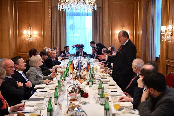 «ԶԱՐԹՕՆՔ», ՊԷՅՐՈՒԹ – Պաշտօնական այցով Գերմանիոյ Դաշնային Հանրապետութիւն գտնուող Հայաստանի Հանրապետութեան նախագահ Արմէն Սարգսեան Նոյեմբեր 28ին աշխատանքային նախաճաշ ունեցած է գերմանական շարք մը առաջատար ընկերութիւններու ղեկավարներուն հետ, որոնք գործունէութիւն կը ծաւալեն Հայաստանի մէջ կամ հետաքրքրուած են Հայաստանի հետ գործակցութեամբ: Ինչպէս կը փոխանցէ «Արմէնփրես»ը, ՀՀ նախագահի աշխատակազմի հասարակայնութեան հետ կապերու վարչութենէն կը տեղեկացնեն, որ հանդիպումը կազմակերպուած է Գերմանիոյ մէջ ՀՀ դեսպանութեան, «OWC» հրատարակչութեան, Գերմանիոյ տնտեսութեան Արեւելեան յանձնաժողովի ու «Արեւելեան Եւրոպա. մանր ու միջին տնտեսվարողներու միութեան» կողմէ։
