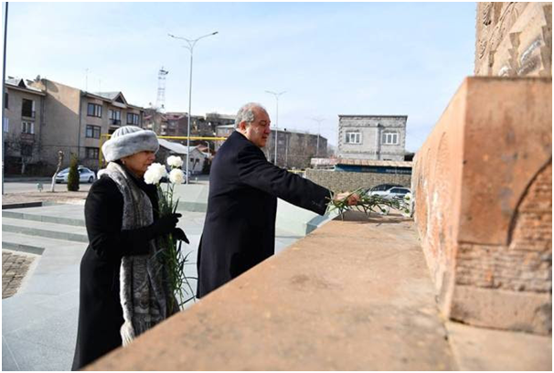 «ԶԱՐԹՕՆՔ», ՊԷՅՐՈՒԹ – Աշխատանքային այցով Լոռի մարզ գտնուող նախագահ Արմէն Սարգսեան եւ տիկին Նունէ Սարգսեան Սպիտակի մէջ ծաղիկներ խոնարհած են 1988 թուականի աւերիչ երկրաշարժի զոհերու յիշատակը յաւերժացնող խաչքարին: