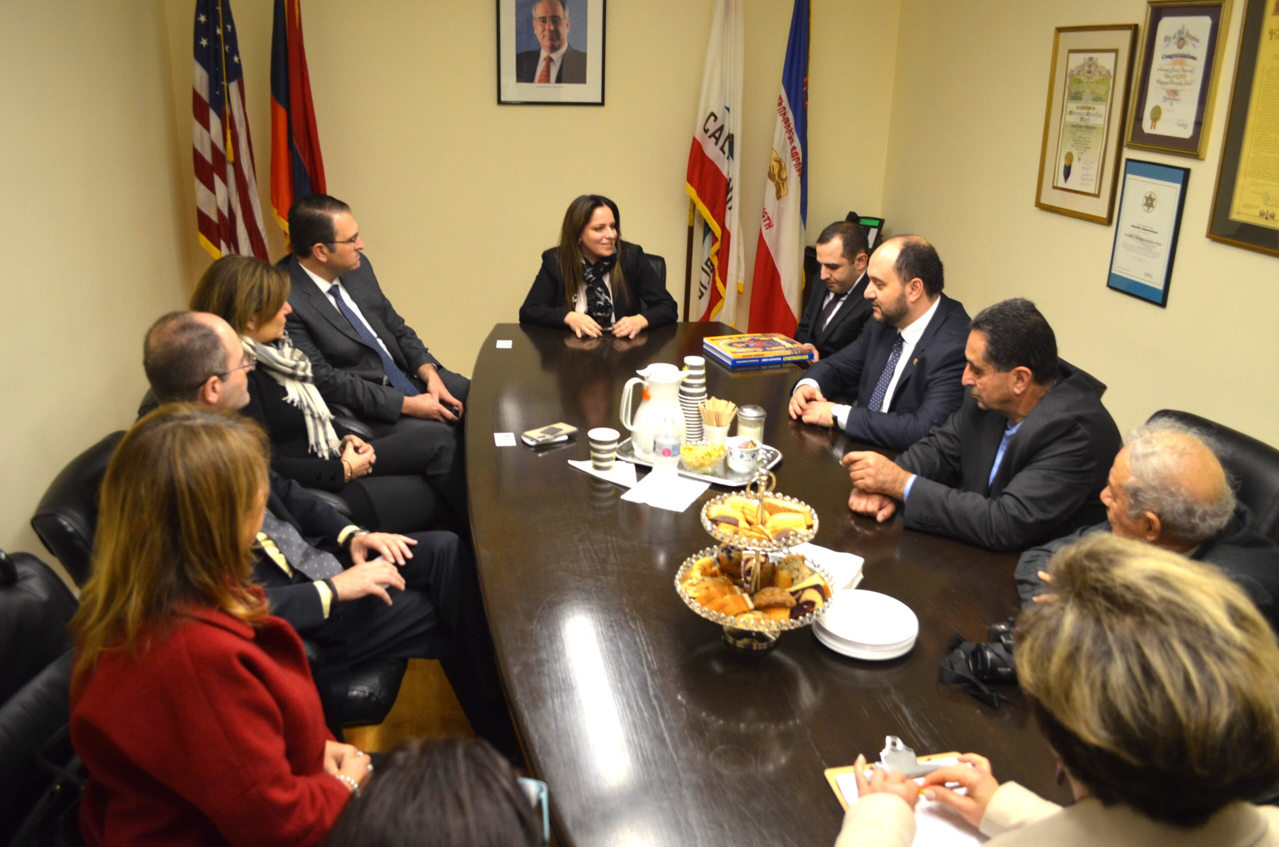 Հայրենի յարգելի նախարարը դիմաւորուեցաւ ՀԲԸՄ-ի Արեւմտեան Ամերիկայի Շրջանակային յանձնաժողովի ատենապետ Տիկ. Թալին Եագուպեանի, Վարժարանիս Հոգաբարձական կազմի ատենապետ Պրն. Գէորգ Զօրեանի, հոգաբարձական կազմի անդամ Տիկ. Ալիս Չաքրեանի, վարժարանիս Կրթական մարմինի ատենապետ Պրն. Վահէ Մարգարեանի, տնօրէնուհի Տիկ. Արփի Աւանէսեանի, փոխտնօրէնուհի Տիկ. Անահիտ Նալպանտեանի եւ Հայերէնի բաժանմունքին կողմէ: