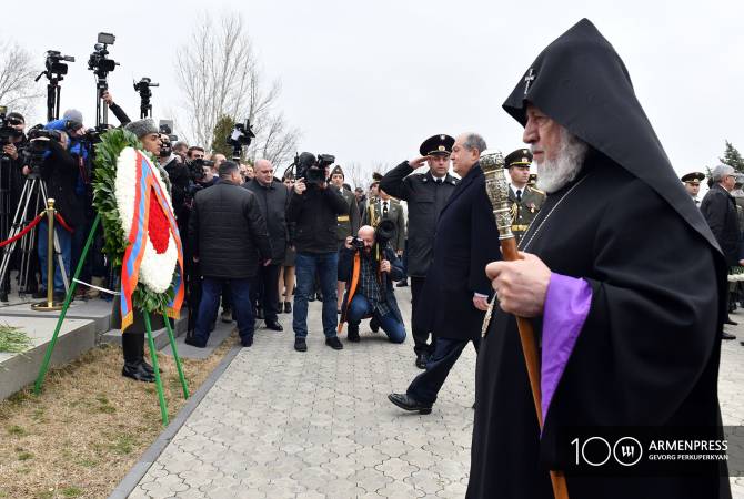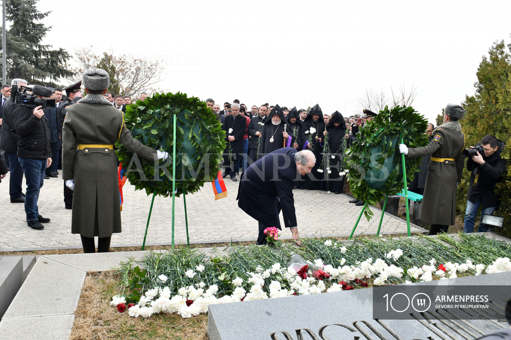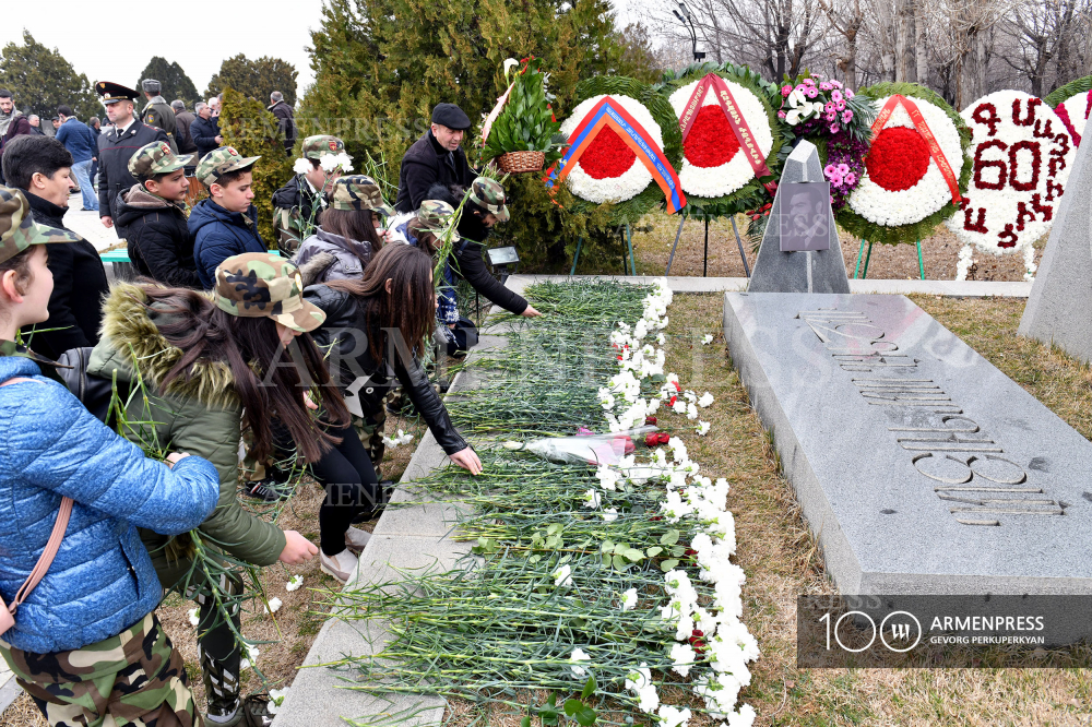 The top leadership of Armenia on March 5 paid tribute to the memory of National Hero of Armenia, first defense minister, Commander (Sparapet) Vazgen Sargsyan in the Yerablur Military Pantheon, reports Armenpress.