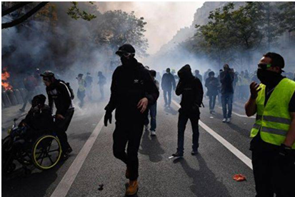 Ոստիկանութեան հետ բախումները տեղի կ’ունենան Ելիսէյեան դաշտերու տարբեր տեղերու մէջ, փողոցը յաճախ կը ծածկէ ծխագլաններու ծուխը, իսկ քամին արցունքաբեր կազ կը բերէ։