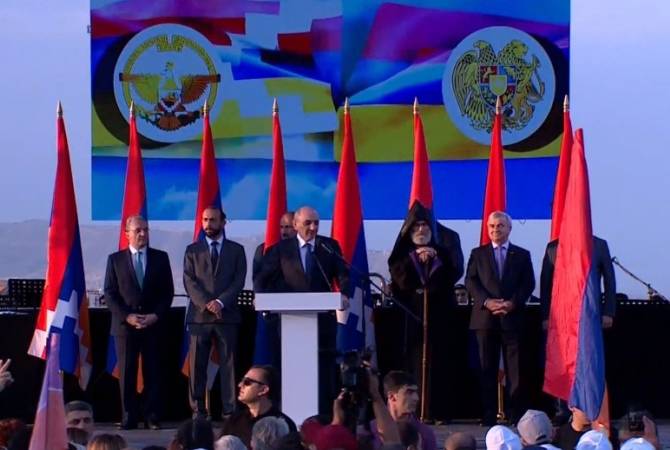 »Armenia and world-spread Armenians were the 1st to react and since then we take Armenia-Artsakh-Diaspora trinity as a way of thinking and lifestyle. Thank to that trinity we were able to overcome the deep wounds of the war, implemented and implement numerous projects. Thank to that trinity we have entered a stable stage. We have said that the Artsakh movement was one of the greatest feats of the Armenian people. Today I announced from here that Artsakh is ready to implement its share of mission with confidence, creating necessary conditions for future victories. Greeting the Prime Minister of Armenia, our sisters and brothers, I want to say that our path is irreversible. We will pursue our tasks and dreams and will make consistent efforts fpr the internatiobnal recognition of Artsakh, coming closer to our dream of having a united motherland», Bako Sahakyan said.