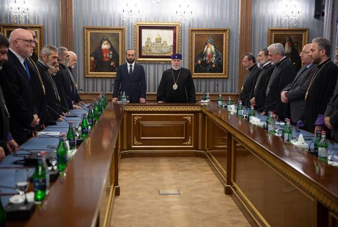 Speaker of Parliament of Armenia Ararat Mirzoyan visited the Mother See of Holy Etchmiadzin to meet with His Holiness Garegin II, Supreme Patriarch and Catholicos of All Armenians, as well as the participants of the meeting of the Supreme Spiritual Council, the Mother See of Holy Etchmiadzin told Armenpress.