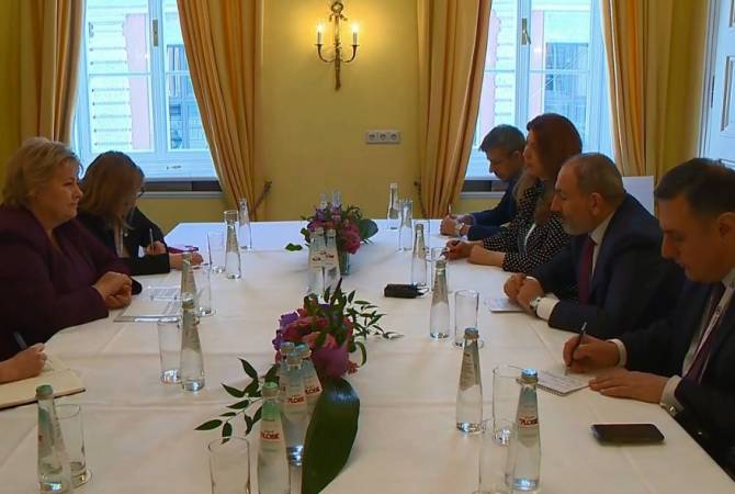 Prime Minister of Armenia Nikol Pashinyan met with Prime Minister of Norway Erna Solberg on the sidelines of the Munich Security Conference, Armenpress correspondent reports from Munich.