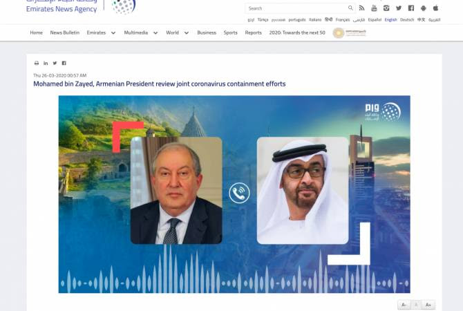 Հայաստանի Հանրապետության նախագահ Արմեն Սարգսյանը և Աբու Դաբիի թագաժառանգ, Արաբական Միացյալ Էմիրությունների զինված ուժերի գլխավոր հրամանատարի տեղակալ շեյխ Մոհամմեդ բին Զայեդ Ալ Նահյանը քննարկել են կորոնավիրուսի դեմ պայքարում համատեղ ջանքեր գործադրելու հնարավորությունները։ «Արմենպրես»-ի փոխանցմամբ, այս մասին գրում է Արաբական Միացյալ Էմիրությունների պետական գործակալություն WAM-ը՝ անդրադառնալով Արմեն Սարգսյանի և շեյխ Մոհամմեդ բին Զայեդ Ալ Նահյանի միջև նախօրեին կայացած հեռախոսազրույցին։