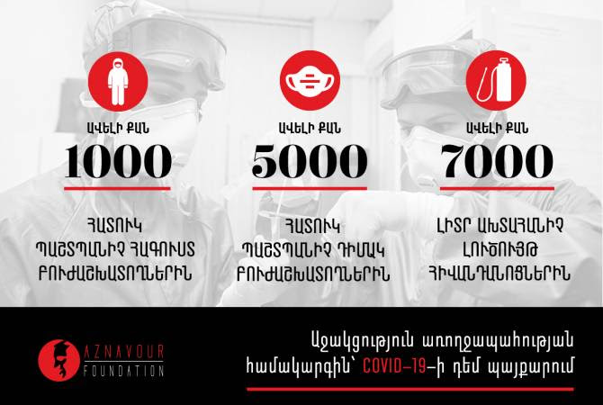 «Ազնավուր հիմնադրամը հայտարարել է COVID-19- ի դեմ պայքարին միանալու մասին։ Սերտորեն համագործակցելով ՀՀ առողջապահության նախարարության հետ՝ Հիմնադրամը հնարավոր է դարձրել 5000 հատ N95 հատուկ դիմակի և 1000 պաշտպանիչ հանդերձանքի ձեռքբերումը բժիշկների և բուժաշխատողների համար, ինչպես նաև ավելի քան 7000 լիտր հատուկ ախտահանիչ հեղուկի մատակարարումը բուժհաստատություններին։ «Արմենպրես»-ի փոխանցմամբ՝ Հիմնադրամն այս մասին հաղորդագրություն է տարածել․