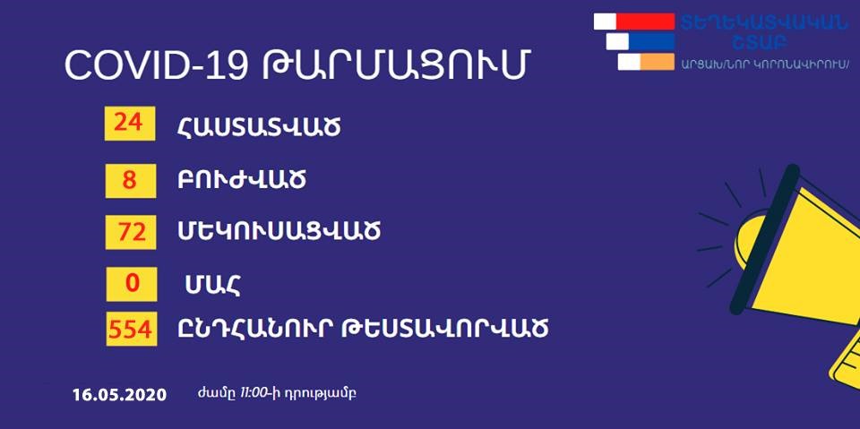 Արցախի տեղեկատուական շտապէն յայտնած են, որ Արցախի մէջ «Քորոնա» ժահրի հաստատուած դէպքերու թիւը 24 է, բուժուածները 8-ն են: