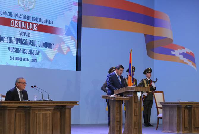 Ինչպես «Արմենպրես»-ին տեղեկացրին Արցախի Հանրապետության Ազգային ժողովի լրատվության և հանրության հետ կապերի բաժնից, այնուհետև, օրենքով սահմանված կարգով, Նախագահ Արայիկ Հարությունյանը երդում է տվել ժողովրդին, նշելով՝ «Ստանձնելով Արցախի Հանրապետության նախագահի պաշտոնը` երդվում եմ. անվերապահորեն կատարել Սահմանադրության պահանջները` հարգել մարդու և քաղաքացու իրավունքներն ու ազատությունները, ապահովել Հանրապետության ինքնիշխանությունը, անկախությունը, տարածքային ամբողջականությունը և անվտանգությունը` ի փառս Արցախի Հանրապետության և ի բարօրություն Արցախի ժողովրդի»: