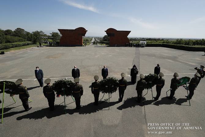 The top leadership and clergymen of Armenia and Artsakh honored the memories of the heroes of Sardarapat Battle. ARMENPRESS reports President of Armenia Armen Sarkissian, Prime Minister Nikol Pashinyan, President of Artsakh Arayik Harutyunyan, Catholicos of All Armenians Karekin II and President of the National Assembly of Armenia Ararat Mirzoyan attended the official event dedicated to the Republic Day and the May Heroic Battles.