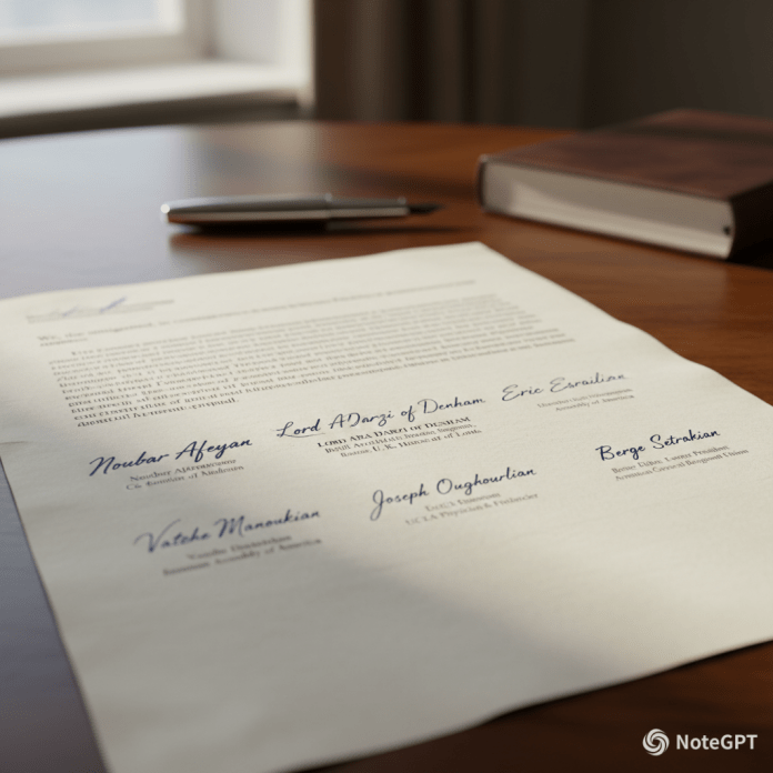 Նամակը ստորագրուած է Նուպար Աֆէեանին՝ Moderna-ի համահիմնադիր, Անթոնի Պարսամեանին՝ Ամերիկայի Հայկական Համագումարի նախկին նախագահ, Տէնհըմի լորտ Արա Տարզիին՝ բրիտանահայ վիրաբոյժ եւ Մեծ Բրիտանիոյ Լորտերու Պալատի անդամ, Էրիք Էսրայէլեանին՝ UCLA-ի բժիշկ, Վաչէ Մանուկեան՝ բարերար, գործարարին, Վահէ Կապրաշ՝ զուիցերահայ գործարարին, Ժոզէֆ Ուղուրլեան ֆրանսահայ ֆինանսատէրին եւ Պերճ Սեդրակեանին՝ Հայ Բարեգործական Ընդհանուր Միութեան Պատուոյ նախագահ։