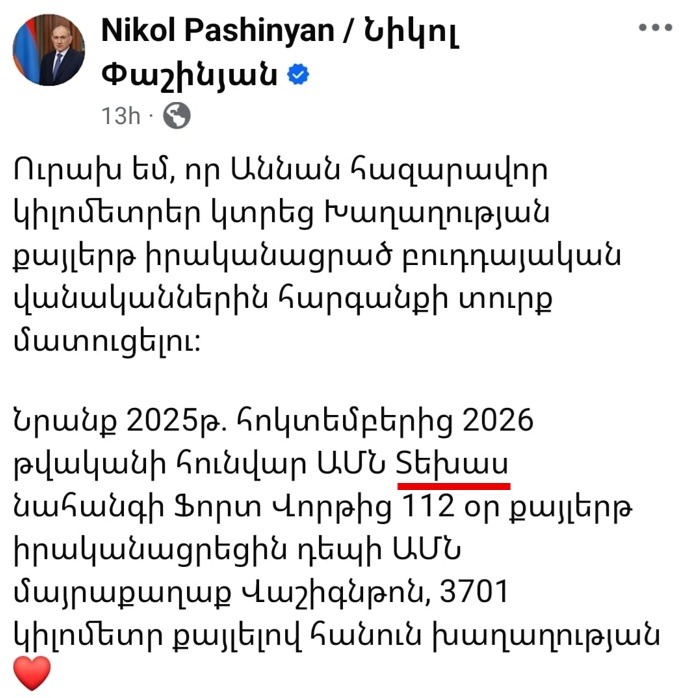 Այս՝ ի միջի այլոց: Ինչ կը վերաբերի այս գրառումին մէջ տեղ գտած միւս երեւոյթին, ի՞նչ ձեւով պէտք է բացատրել ՀՀ Վարչապետէն մինչեւ հայաստանցի վերջին լրագրողին կամ շարքային քաղաքացիին, որ ԱՄՆ-ի մէջ ՏեԽաս անունով նահանգ չկայ: Կայ Թեքսաս (Texas) անունով նահանգ (որուն կ՛ակնարկէ Փաշինեանին գրառումը), որ ԱՄՆ-ի երկրորդ ամենամեծ նահանգն է, 695,660.446 քառ. քլմ տարածութեամբ, այսինքն՝  ՀՀ-էն 24 անգամ աւելի մեծ) եւ շուրջ 31 միլիոն հաշուող բնակչութեամբ, որուն անունը սխալ գրելը յարիր չէ հինաւուրց նայիրեան ազգի ժառանգորդները ինքզինք համարող ժողովուրդին ներկայացուցիչներուն…: