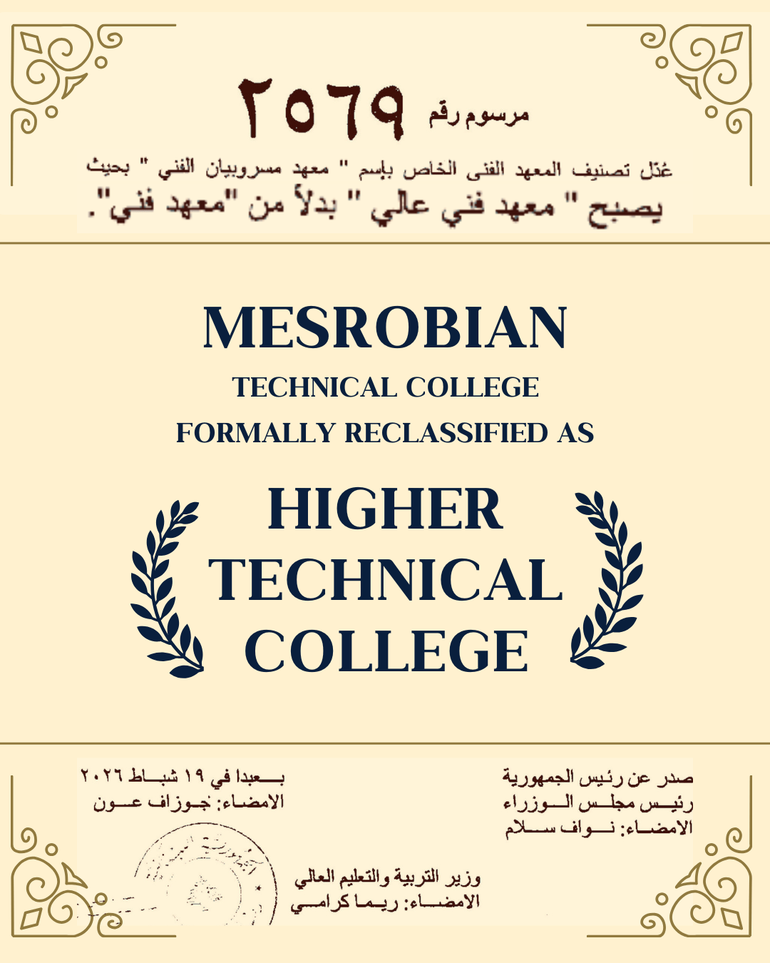 The decree No. 2569 was officially issued from the Presidential Palace in Baabda on February 19, 2026. This important legal attribute was ratified by the signatures of the President of the Republic of Lebanon, Joseph Aoun, the President of the Council of Ministers, Prime Minister Nawaf Salam, and the Minister of Education and Higher Education, Rima Karami.