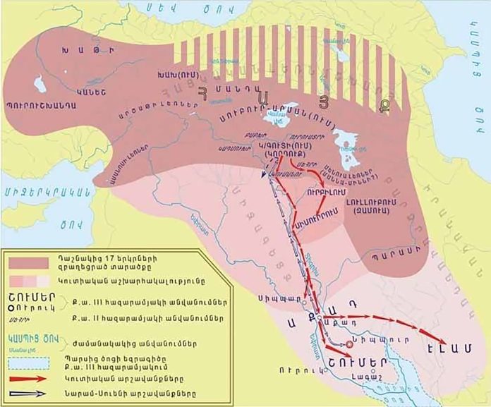 Փաստօրէն, Արամանեակի որդի Կադմոսէն {Ք. Ա. 2550-ական – 2000-ական թուականներուն (ըստ Եօթանասնից աղիւսակի)} մինչեւ Կուտիական աւելի քան եօթ տասնամեայ աշխարհակալութեան ժամանակաշրջանը (Ք. Ա. 23-22-րդ դարեր), որ կը տարածուէր Էլամէն մինչեւ Ամանոսի (Մայրիներու) լեռները եւ Հայկական լեռնաշխարհի մեծ մասէն մինեւ Պարսից ծոց,[17] Յաբեթոսթյան (հնդեւրոպական) կամ Յաբեթական եւ մասնաւորապէս հայկական՝ Հայկազունեան ու Սէմա-քամական ժողովուրդներու թէ խռովեալ եւ թէ խաղաղ յարաբերութեանց կապը չէ խզուած, եւ այս տարածաշրջանի հնագոյն քաղաքակրթութիւն կերտող ժողովուրդները իրենց հնագոյն պատմութիւնը մեզ աւանդած են աւանդազրոյցներով, աւանդավէպերով, դիւցազնավէպերով ու վիպասքներով: