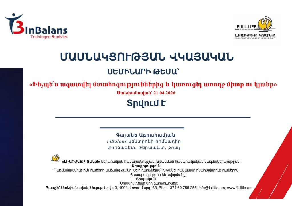 Այսօր՝ ապրիլի 21, 2026-ի կեսօրին, «Լիարժեք կյանք» ՀԿ Ստեփանավանի կենտրոնին մեջ կայացավ օգտաշատ մի սեմինար, թեմա ունենալով՝ «Ինչպե՞ս ազատվել մտահոգություններից և կառուցել առողջ միտք ու կյանք»: Սեմինարին ներկա եղան «ԼԻԱՐԺԵՔ ԿՅԱՆՔ» ներառական հասարակության խթանման հասարակական կազմակերպության ծառայություններից օգտվող երեխաների ծնողներ, կենտրոնի մասնագետներ, և այլ հյուրեր: